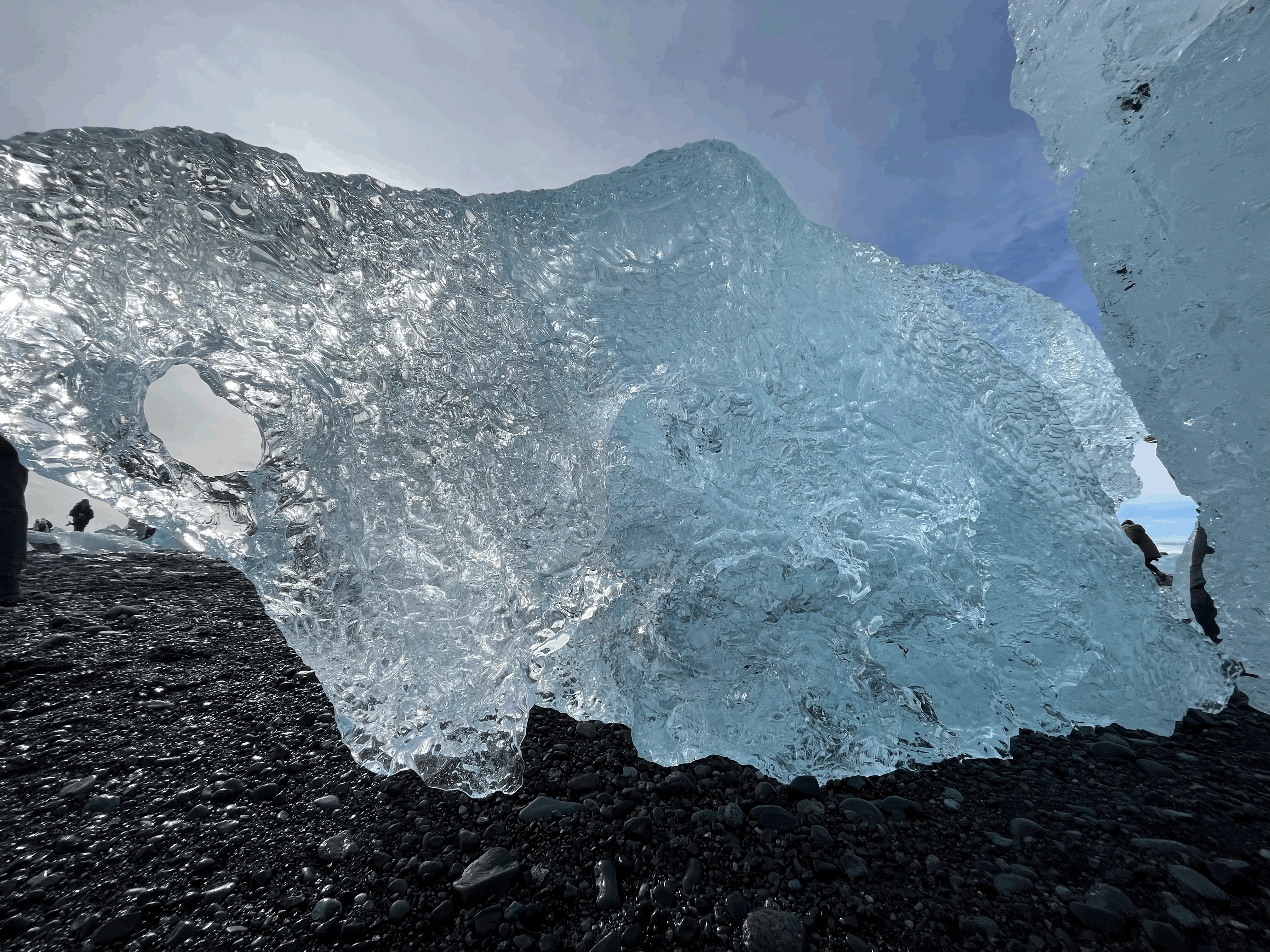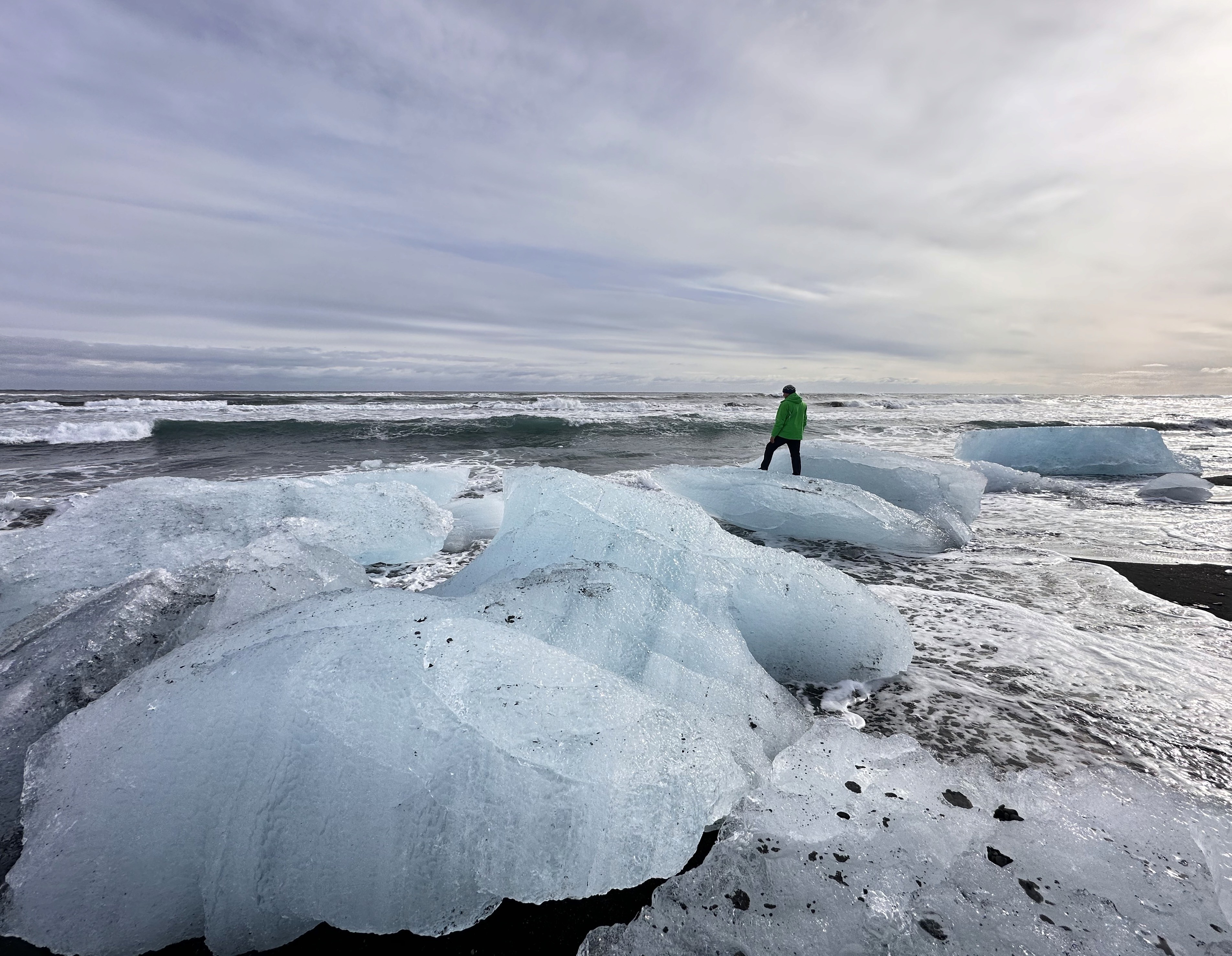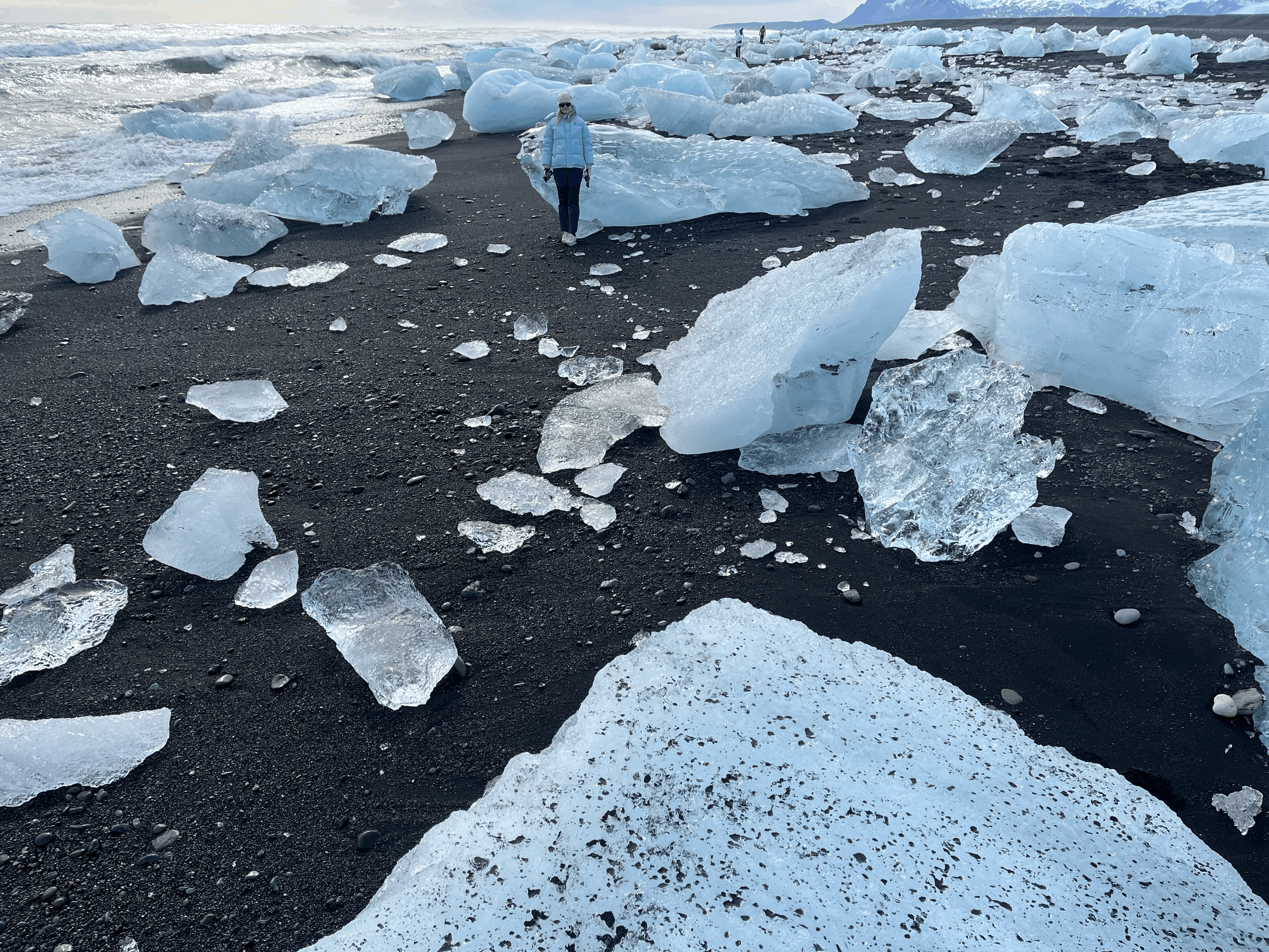 Along the way, some of them get washed ashore on the beach. These ice blocks are sculpted by waves and glitter in the sun.